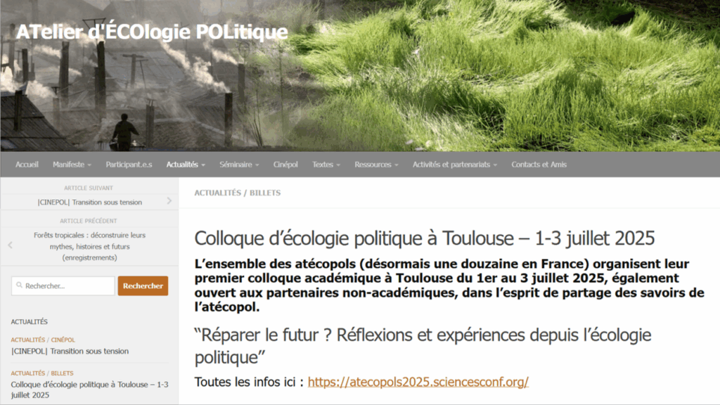 Un événement important s’est tenu à Toulouse du 1er au 3 juillet 2025 dans les locaux de Sciences Po au bord de la Garonne : le colloque « Réparer le futur ? Réflexions et expériences depuis l’écologie politique », organisé par les Ateliers d’écologie politique de Toulouse : les ATECOPOL. Trois journées de rencontres Inter-ATECOPOL, pour une vraie respiration scientifique et démocratique ! Le Collectif Citoyen 06 y a participé. Debriefing.
