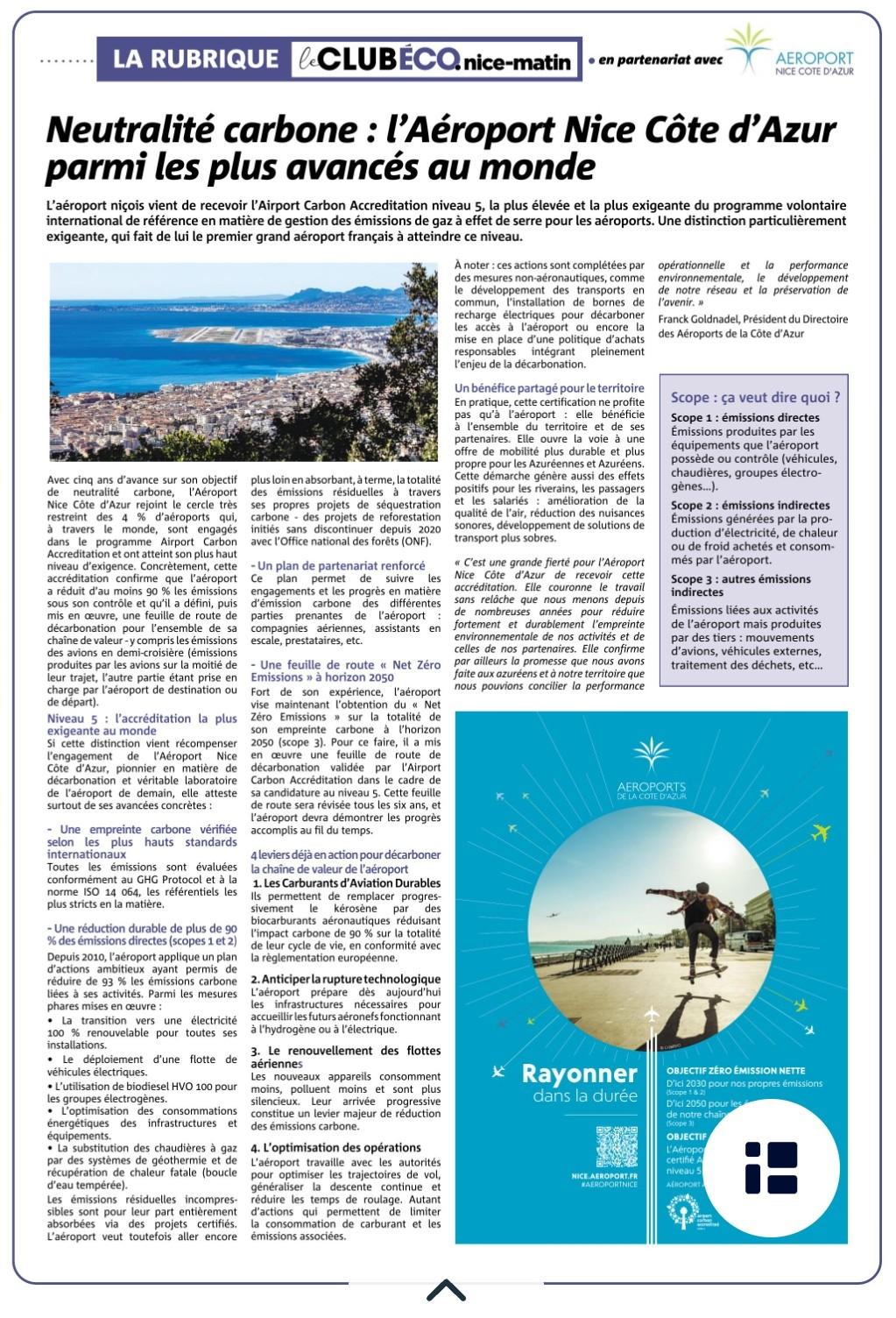 Le 15 décembre 2025 est parue, en page 25 de l’édition Nice-Matin, une pleine page titrée « Neutralité carbone : l’Aéroport Nice Côte d’Azur parmi les plus avancés au monde », dans le cadre de « La Rubrique Le ClubEco Nice-Matin, en partenariat avec l’aéroport Nice Côte d’Azur ».
